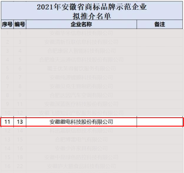 近日,經安徽省商標品牌示范企業推介委員會及專家評定、公示,徽電科技被授予“安徽省商標品牌示范企業”稱號。