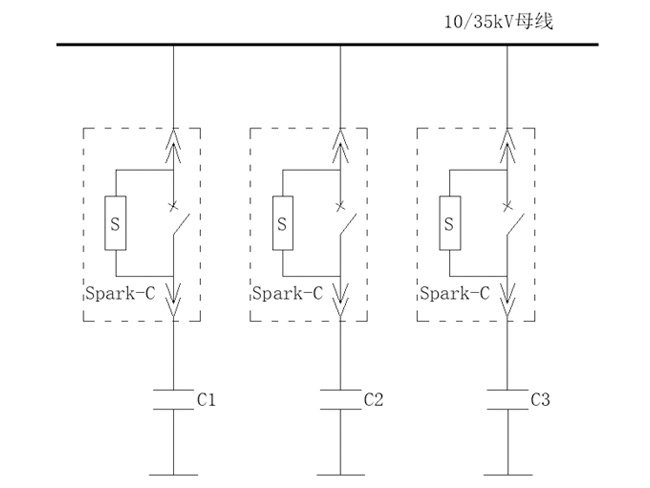 并聯(lián)補償電容器組投入時產(chǎn)生高達10~20倍合閘涌流,大幅縮短電容使用壽命;分閘時斷路器重燃產(chǎn)生高達6~7倍過電壓,嚴重影響系統(tǒng)運行和設備安全。10kV Spark-C相控柜提供優(yōu)異的單組電容器/背靠背電容器組投切解決方案,適用于工業(yè)及電力系統(tǒng)的無功補償系統(tǒng),如下圖。